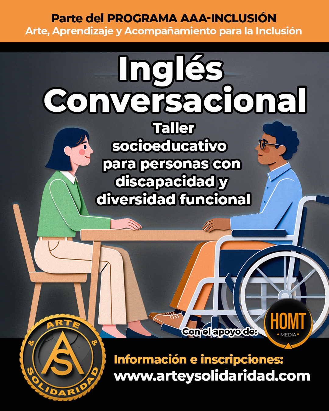 En el marco del programa AAA-Inclusión para personas con discapacidad y diversidad funcional, ponemos en marcha el taller de Inglés Conversacional, una propuesta socioeducativa gratuita orientada a mejorar la comunicación en inglés a partir de los intereses, capacidades y objetivos reales de cada participante.